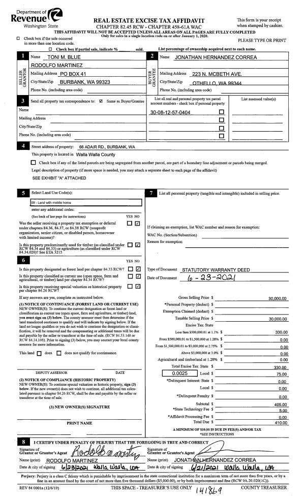 | 3 | 06/24/2021 | SWD | STATUTORY WARRANTY DEED | BLUE TONI | CORREA JONATHAN HERNANDEZ | | | $30,000.00 | 141869 | 2021-07647 |