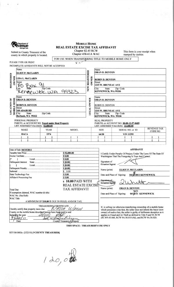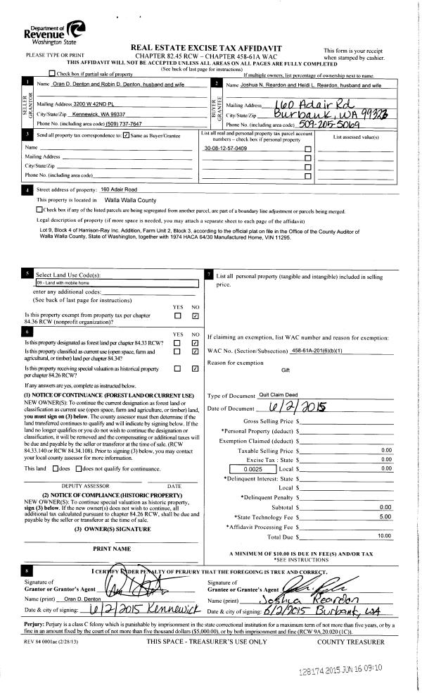 | 1 | 06/25/2015 | MH AFFIDAV | MOBILE HOME AFFIDAVIT | DENTON ORAN D & ROBIN D | REARDON JOSHUA N & HEIDI L | | | | 128245 | MHAFF-128245 |