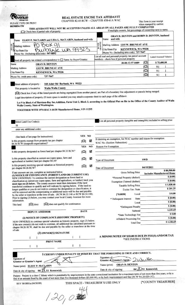 | 4 | 04/22/2011 | WARRANTY D | WARRANTY DEED | MC CLARIN, ELIOT P & LISA L | DENTON, ORAN D & ROBIN D | | | $80,500.00 | 120044 | 2011-03270 |