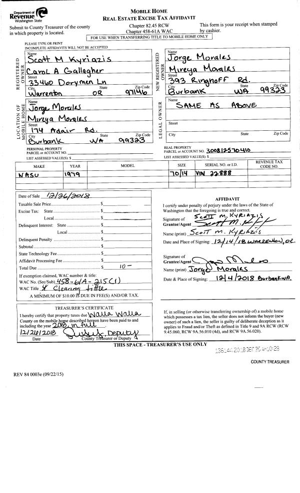 | 3 | 12/26/2018 | MH AFFIDAV | MOBILE HOME AFFIDAVIT | KYRIAZIS SCOTT M | MORALES JORGE & MIREYA | | | | 136144 | MHAFF-136144 |