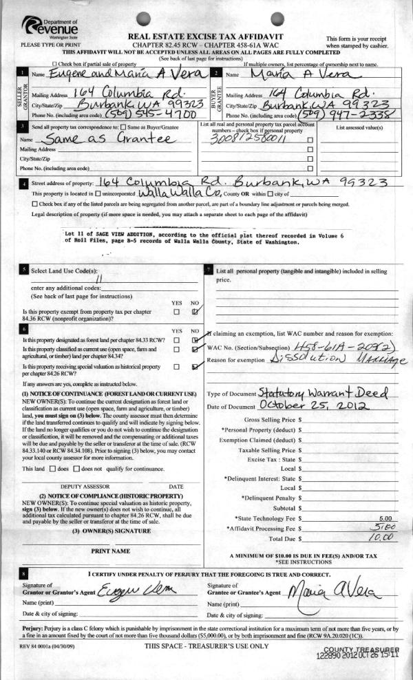 | 3 | 10/26/2012 | QCD | QUIT CLAIM DEED | VERA, EUGENE | VERA, MARIA A | | | $0.00 | 122890 | 2012-09455 |