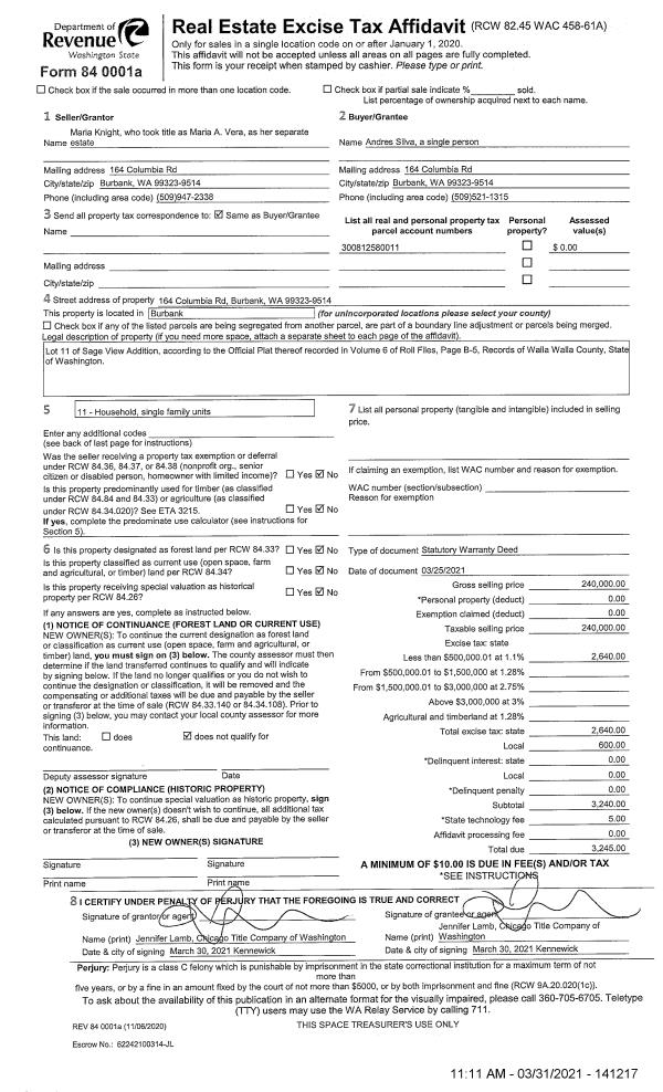 | Mailing Address: | ANDRES SILVA CHAVEZ 164 COLUMBIA RD BURBANK, WA 99323 | % Ownership: | 100.0000000000% |