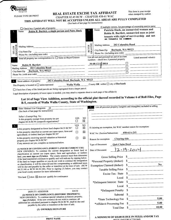 | 3 | 12/19/2014 | QCD | QUIT CLAIM DEED | BARTLETT ROBIN R | HUCK PATRICIA | | | $0.00 | 127231 | 2015-00116 |