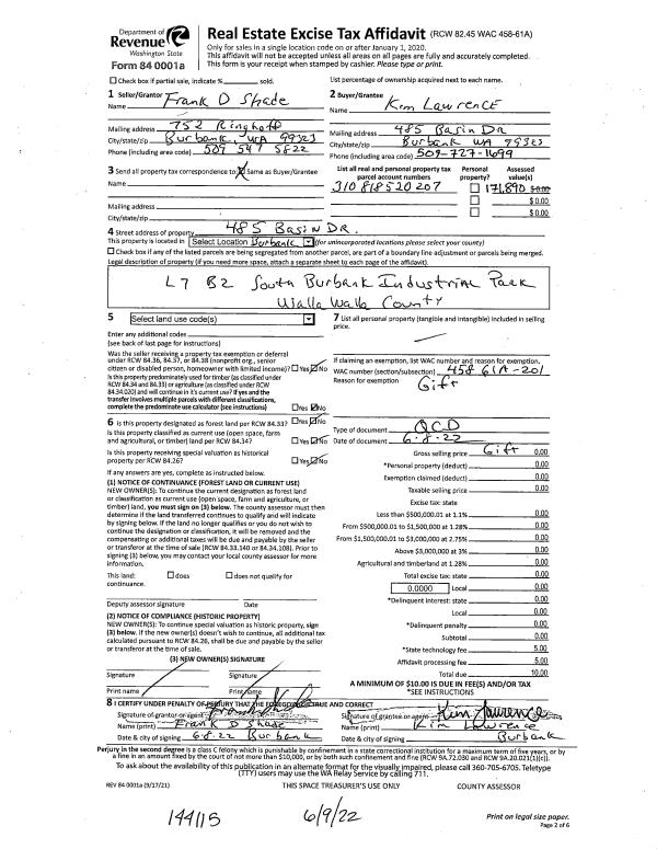| Mailing Address: | 485 BASIN DR BURBANK, WA 99323 | % Ownership: | 100.0000000000% |
