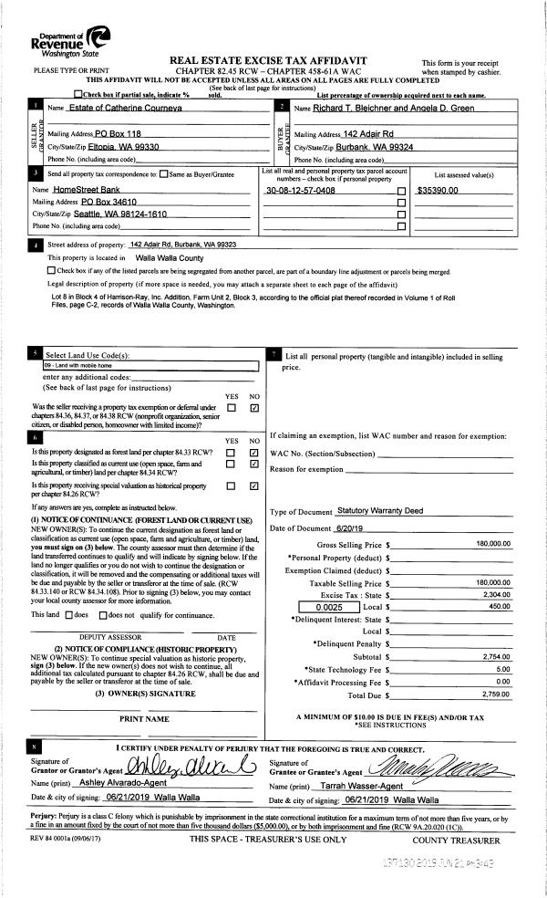 | 1 | 06/21/2019 | SWD | STATUTORY WARRANTY DEED | COURNEYA CATHERINE S ESTATE OF | BLEICHNER RICHARD T | | | $180,000.00 | 137130 | 2019-04403 |