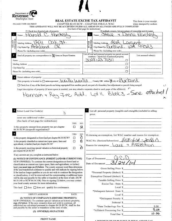 | 2 | 04/02/2014 | QCD | QUIT CLAIM DEED | HARDESTY HAROLD C | HARDESTY STEVEN R & DONNA L | | | | 125666 | 2014-02244 |