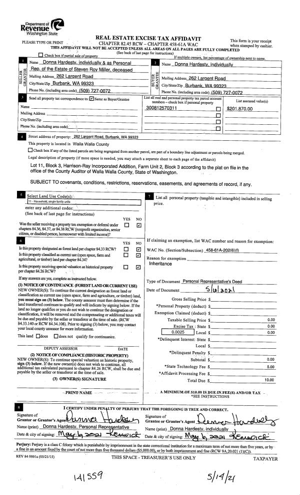 | 1 | 05/06/2021 | DPR | DEED OF PERSONAL REPRESENTATIVE | HARDESTY STEVEN R & DONNA L | HARDESTY DONNA | | | $0.00 | 141559 | 2021-05866 |