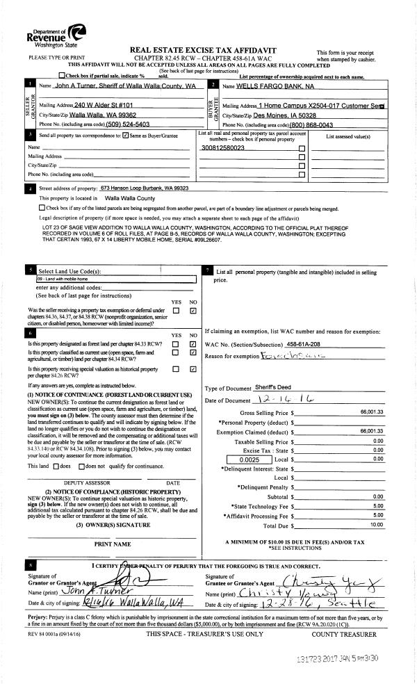 | 4 | 01/05/2017 | SHERIFFS D | SHERIFFS DEED | CRITES SCOTT S ESTATE OF | WELLS FARGO BANK NA CUSTOMER SERVICE | | | $66,001.00 | 131723 | 2017-00143 |