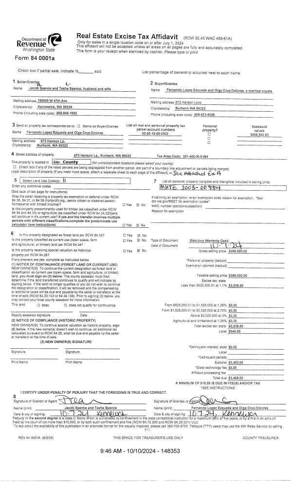 | 1 | 10/10/2024 | SWD | STATUTORY WARRANTY DEED | SPENCE JACOB A & TASHA L | EZQUEDA FERNANDO LOPEZ | | | $258,000.00 | 148353 | 2024-05907 |