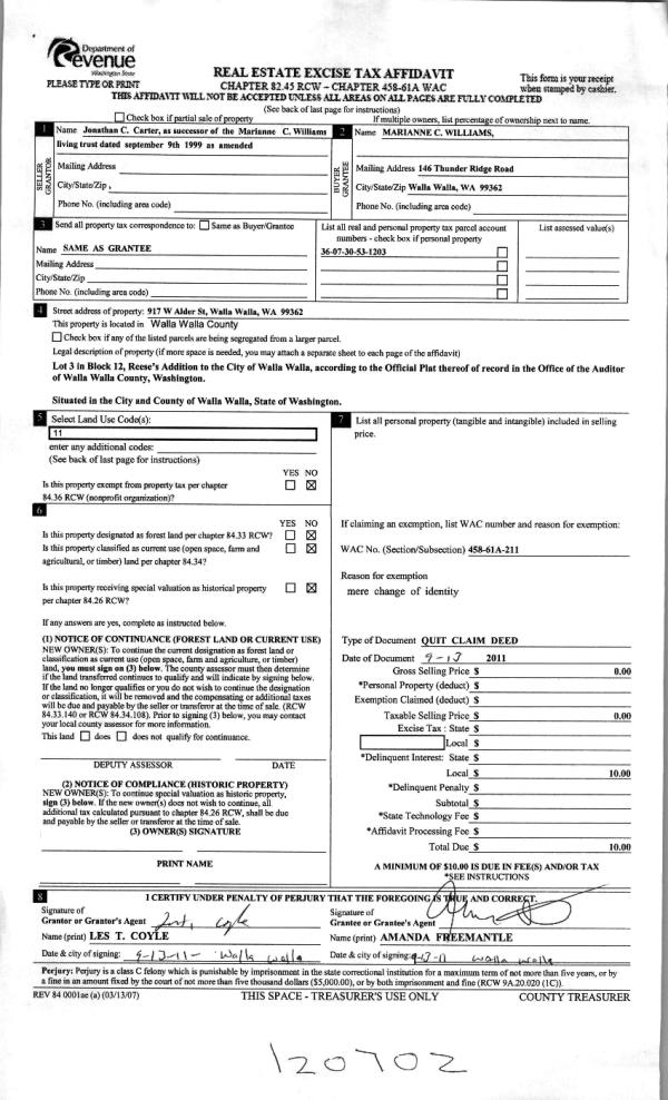 | 3 | 09/15/2011 | QCD | QUIT CLAIM DEED | WILLIAMS, MARIANNE LIVING TRST | WILLIAMS, MARIANNE C | | | | 120702 | 2011-07210 |