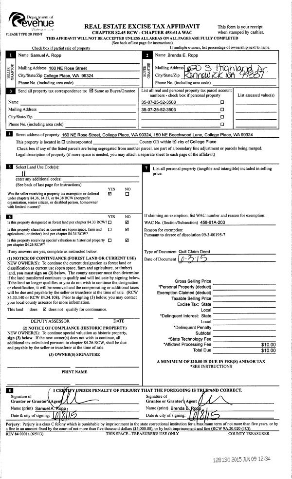| 2 | 06/03/2015 | QCD | QUIT CLAIM DEED | ROPP SAMUEL A & BRENDA E | ROPP BRENDA | 2 PARCELS | | | 128130 | 2015-04858 |