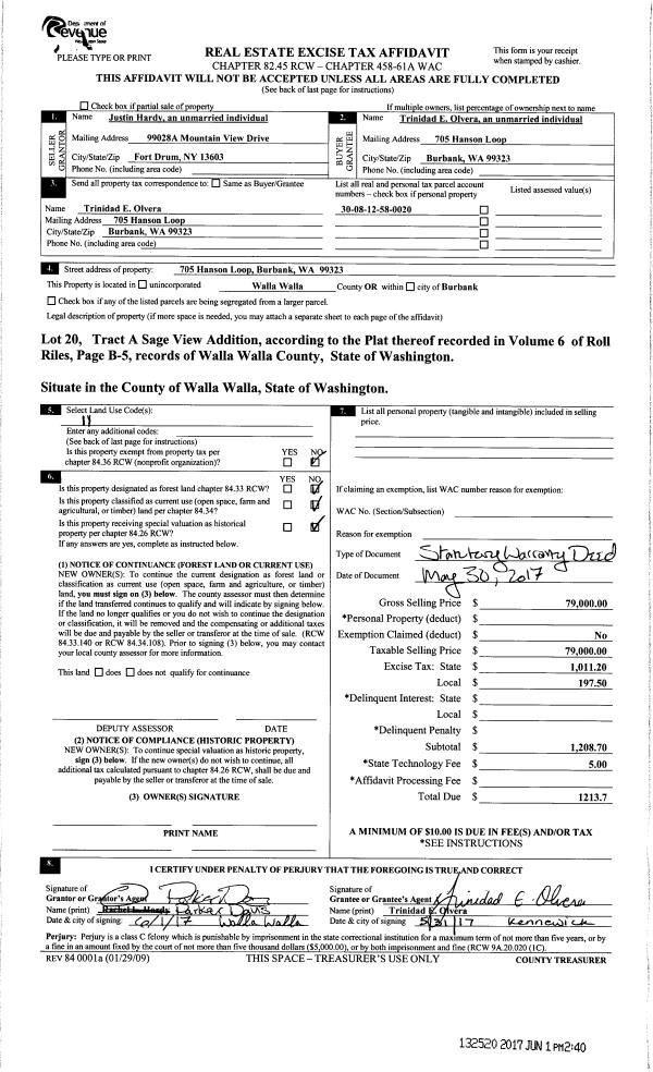 | 1 | 06/01/2017 | SWD | STATUTORY WARRANTY DEED | HARDY JUSTIN F | OLVERA TRINIDAD E | | | $79,000.00 | 132520 | 2017-04190 |