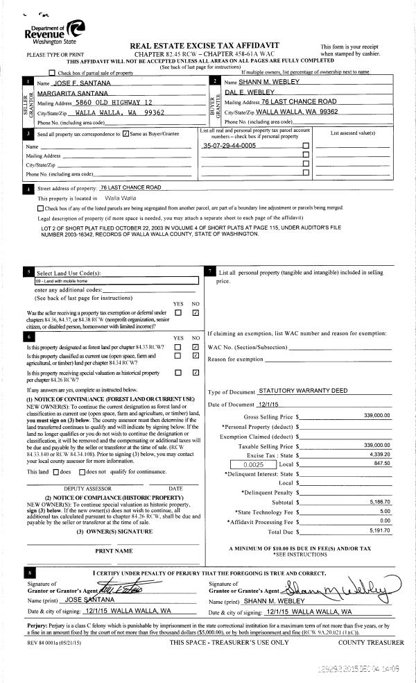 | 2 | 12/04/2015 | SWD | STATUTORY WARRANTY DEED | SANTANA JOSE F & MARGARITA | WEBLEY SHANN M | | | $339,000.00 | 129292 | 2015-10401 |