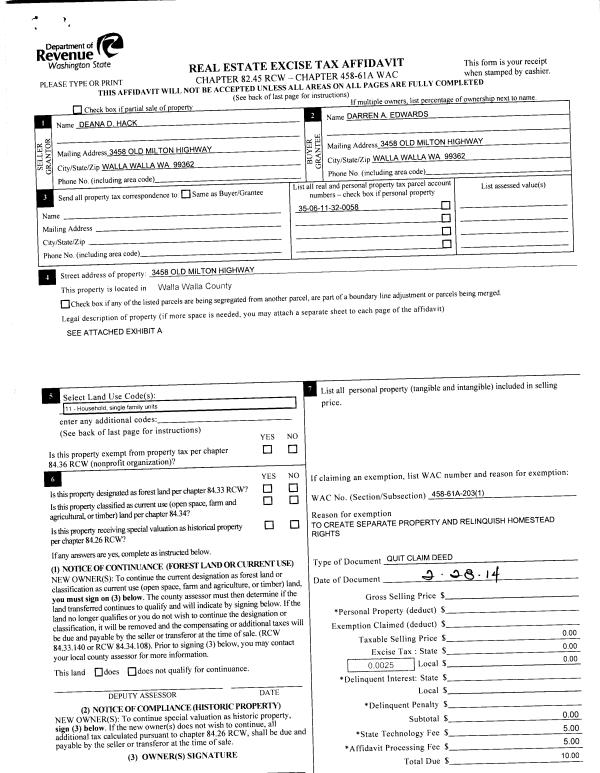 | 4 | 05/03/2006 | QCD | QUIT CLAIM DEED | EDWARDS, DARREN A | WALLA WALLA COUNTY | | | $315.00 | 110169 | 2006-04976 |