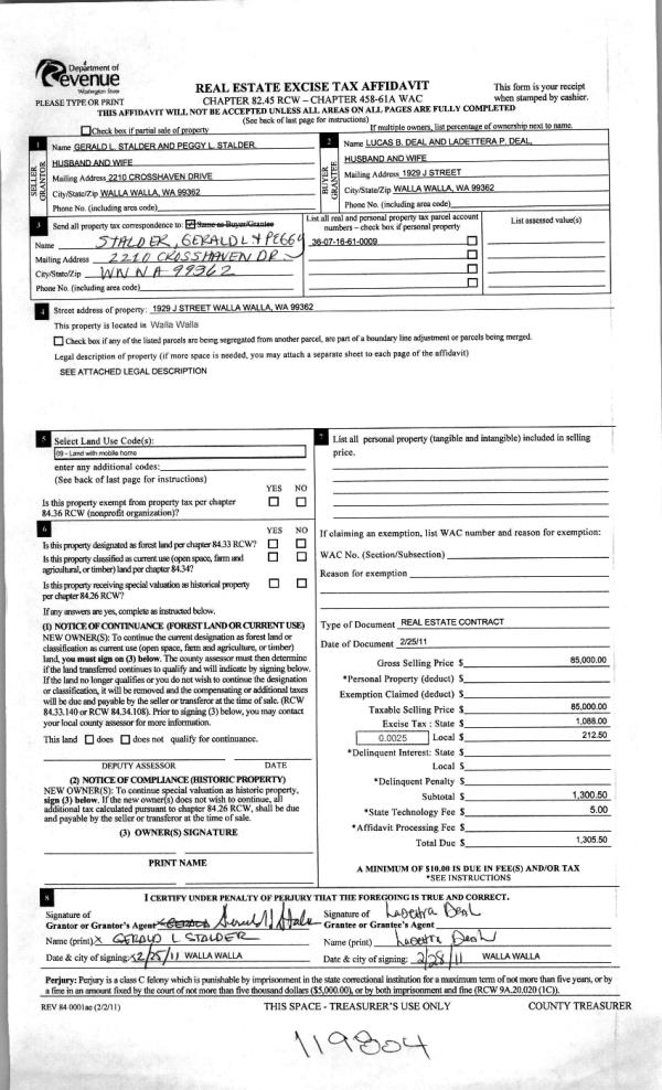 | 4 | 02/28/2011 | WARRANTY D | WARRANTY DEED | STALDER, GERALD L & PEGGY L | DEAL, LUCAS B & LADETTRA P | | | $85,000.00 | 119804 | 2011-01849 |