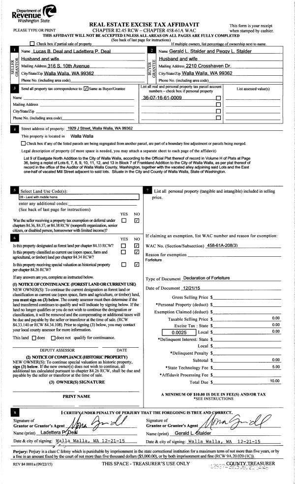 | 3 | 12/21/2015 | DECF | DECLARATION OF FOREFEITURE | DEAL LUCAS B & LADETTRA P | STALDER GERALD L & PEGGY L | | | $0.00 | 129374 | 2015-10861 |