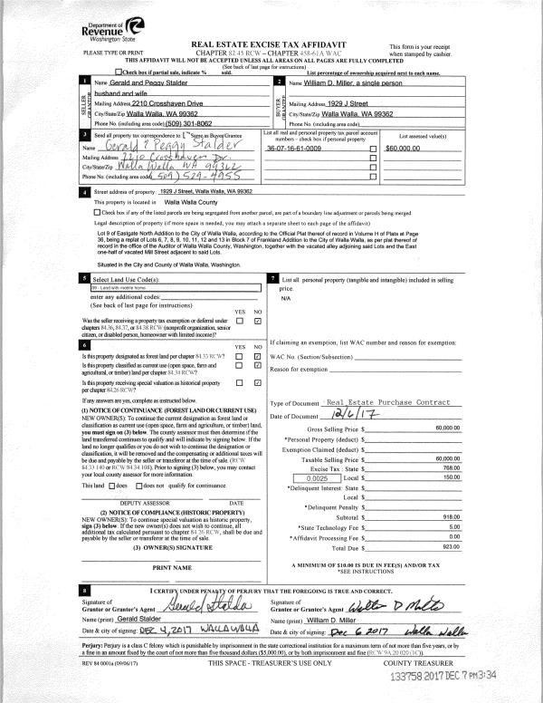 | 2 | 12/07/2017 | REAL ESTAT | REAL ESTATE CONTRACT | STALDER GERALD L & PEGGY L | MILLER WILLIAM D | | | $60,000.00 | 133758 | 2017-09829 |
