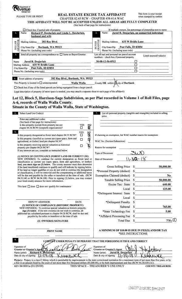 | 1 | 12/05/2018 | SWD | STATUTORY WARRANTY DEED | DES JARLAIS RICHARD P & LINDA L | DESJARLAIS JARED R | | | $50,000.00 | 136037 | 2018-10035 |