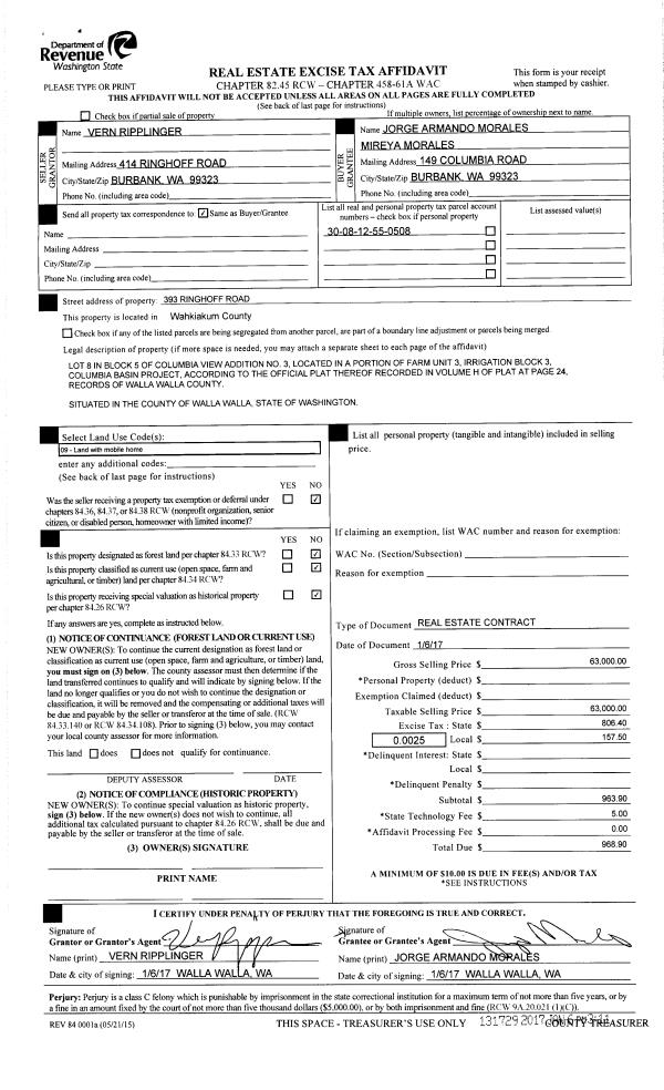 | 6 | 01/06/2017 | REAL ESTAT | REAL ESTATE CONTRACT | RIPPLINGER VERN | MORALES JORGE & MIREYA | | | $63,000.00 | 131729 | 2017-00178 |