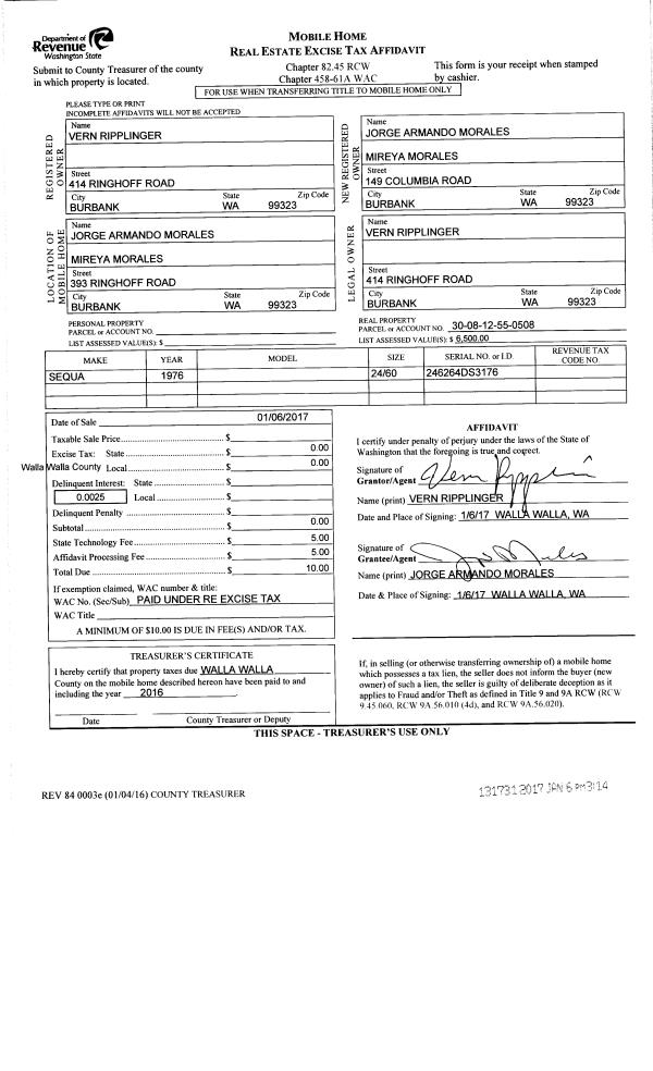 | 5 | 01/06/2017 | MH AFFIDAV | MOBILE HOME AFFIDAVIT | RIPPLINGER VERN | MORALES JORGE & MIREYA | | | | 131731 | MHAFF-131731 |
