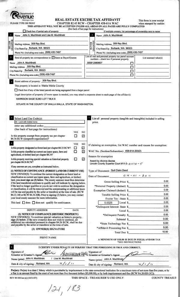 | 2 | 12/29/2011 | QCD | QUIT CLAIM DEED | MUCHLINSKI, JOHN & LISA | MUCHLINSKI, JOHN A | | | | 121183 | 2011-10273 |