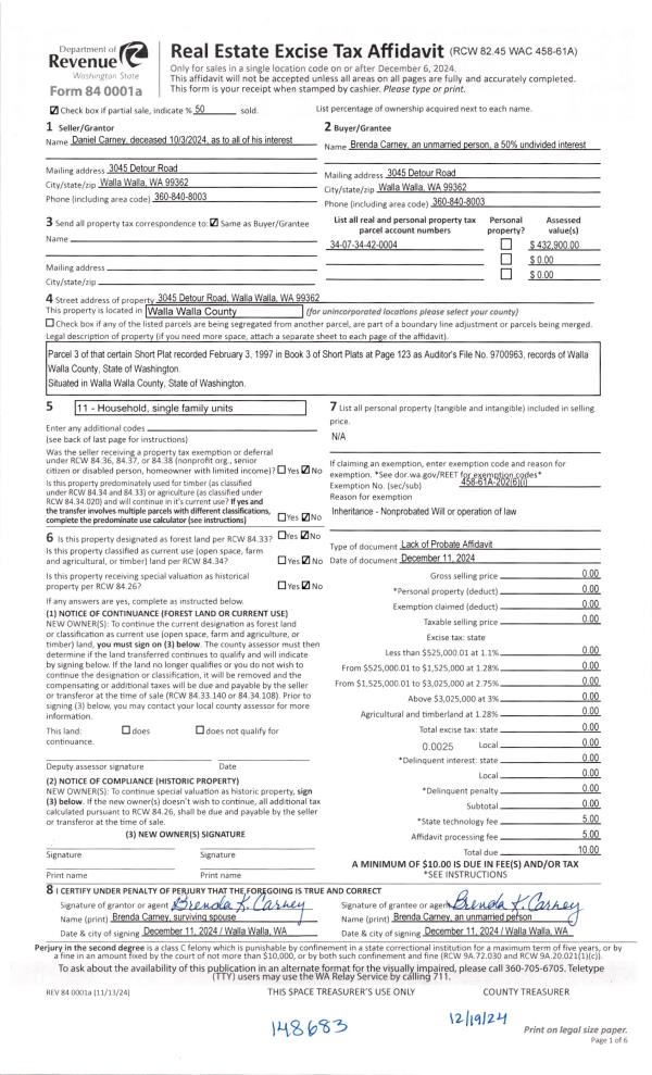 | 1 | 12/19/2024 | LOPA | LACK OF PROBATE AFFIDAVIT | CARNEY DANIEL & BRENDA | CARNEY BRENDA | | | | 148683 | 2024-07310 |