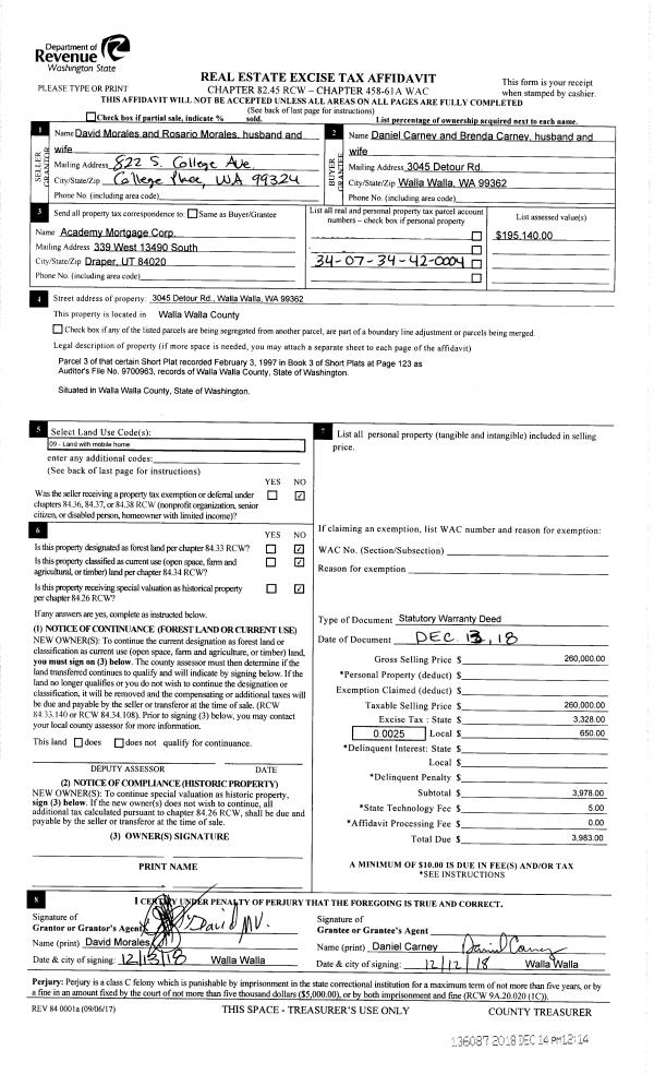 | 2 | 12/14/2018 | SWD | STATUTORY WARRANTY DEED | MORALES DAVID & ROSARIO | CARNEY DANIEL & BRENDA | | | $260,000.00 | 136087 | 2018-10302 |