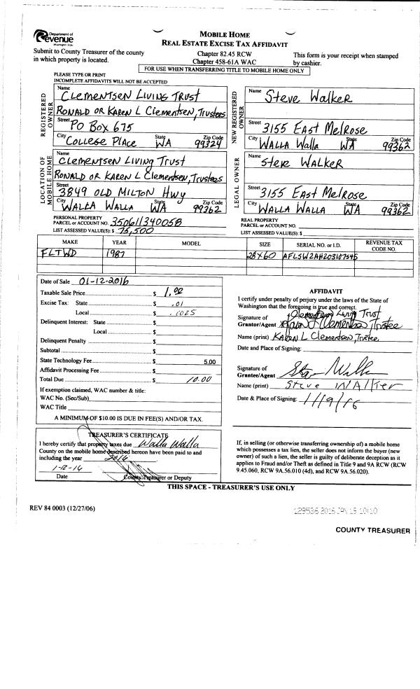 | 2 | 01/12/2016 | MH AFFIDAV | MOBILE HOME AFFIDAVIT | THE CLEMENTSEN LIVING TRUST | WALKER STEVE | | | $1.00 | 129536 | MHAFF-129536 |