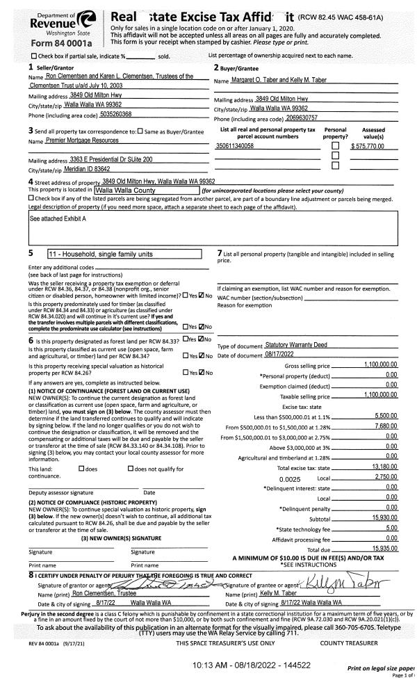 | 1 | 08/18/2022 | SWD | STATUTORY WARRANTY DEED | THE CLEMENTSEN LIVING TRUST | TABER MARGARET O & KELLY M | | | $1,100,000.00 | 144522 | 2022-06919 |
