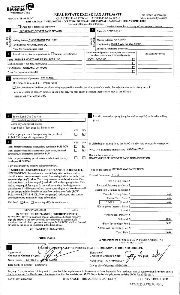 | 3 | 02/25/2016 | SWP | Special Warranty Deed | SECRETARY OF VETERANS AFFAIRS | SELBY JOY ANN | | | $0.00 | 129745 | 2016-01456 |