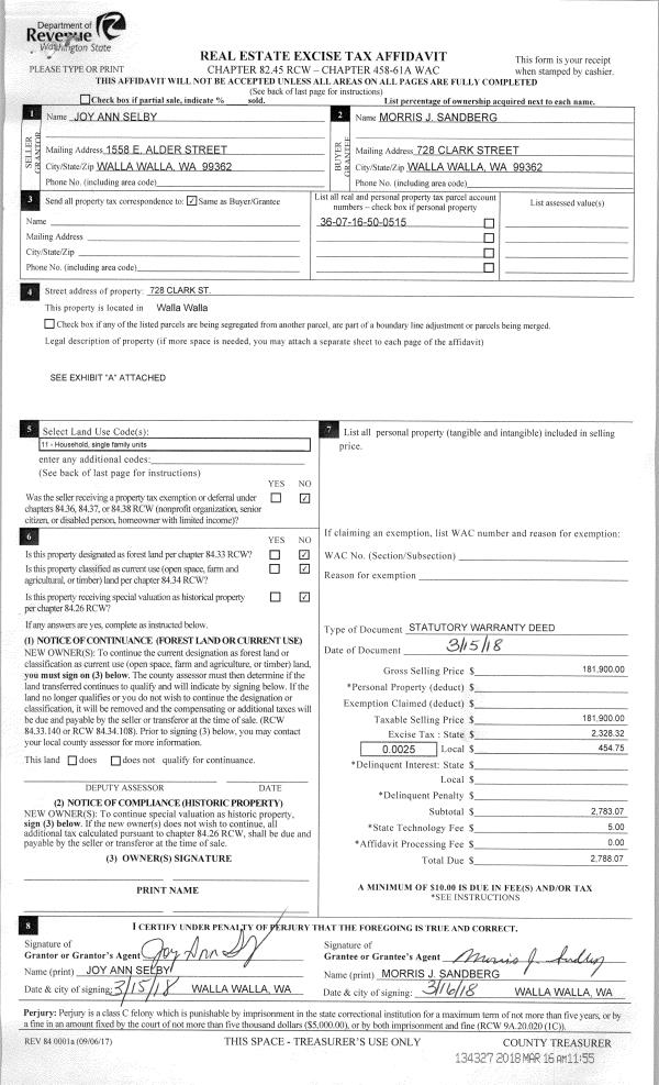 | 2 | 03/16/2018 | SWD | STATUTORY WARRANTY DEED | SELBY JOY ANN | SANDBERG MORRIS J | | | $181,900.00 | 134327 | 2018-02075 |