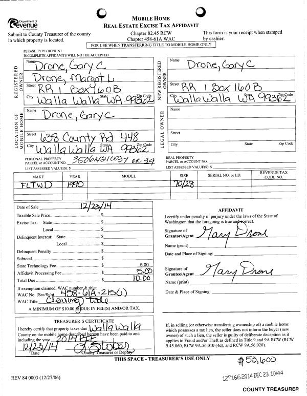 | 6 | 12/23/2014 | MH | MOBILE HOME | DRONE GARY C & MARGOT L | DRONE GARY C | | | $0.00 | 127166 | MHAFF-127166 |