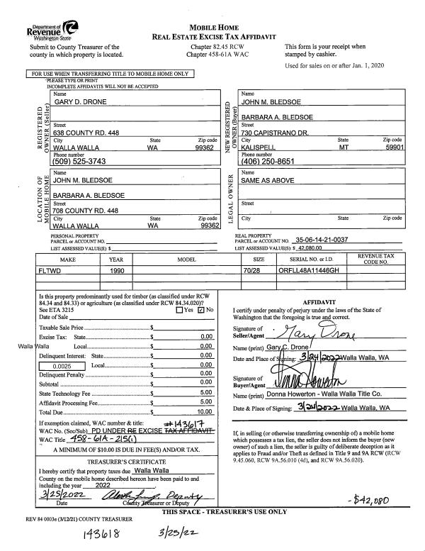 | 4 | 03/25/2022 | MH AFFIDAV | MOBILE HOME AFFIDAVIT | DRONE GARY C | BLEDSOE JOHN M & BARBARA A | | | | 143618 | MHAFF-143618 |