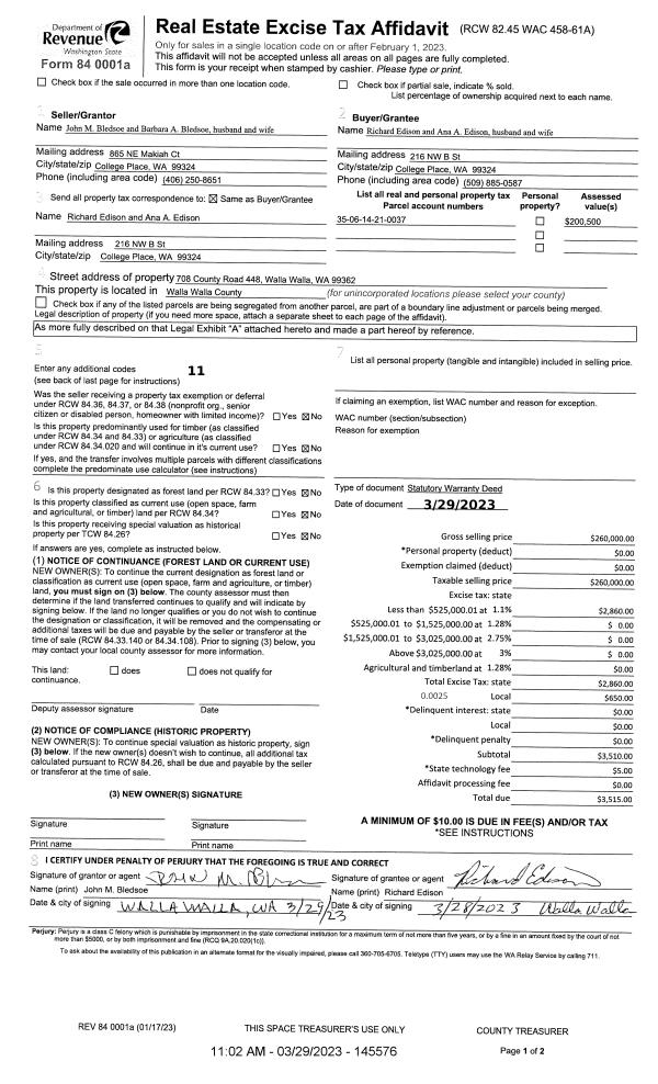 | 2 | 03/29/2023 | SWD | STATUTORY WARRANTY DEED | BLEDSOE JOHN M & BARBARA A | EDISON RICHARD & ANA A | | | $260,000.00 | 145576 | 2023-01584 |
