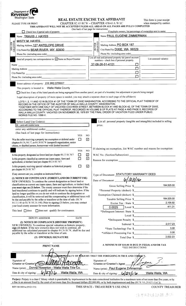 | 1 | 06/28/2016 | SWD | STATUTORY WARRANTY DEED | HAYES TRAVIS J & MISTY M | ZIMMERMAN PAUL EUGENE | | | $164,525.00 | 130508 | 2016-04978 |