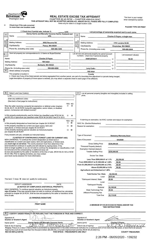 | 1 | 06/05/2020 | SWD | STATUTORY WARRANTY DEED | HARRIS DANNY | PAYNE CHARLES D | | | $230,000.00 | 139232 | 2020-05052 |
