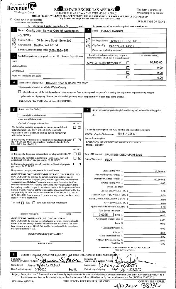 | 2 | 04/16/2020 | TRUSTEES D | TRUSTEE'S DEED | COOK RALPH JAMES | HARRIS DANNY | | | $113,566.00 | 138935 | 2020-03232 |