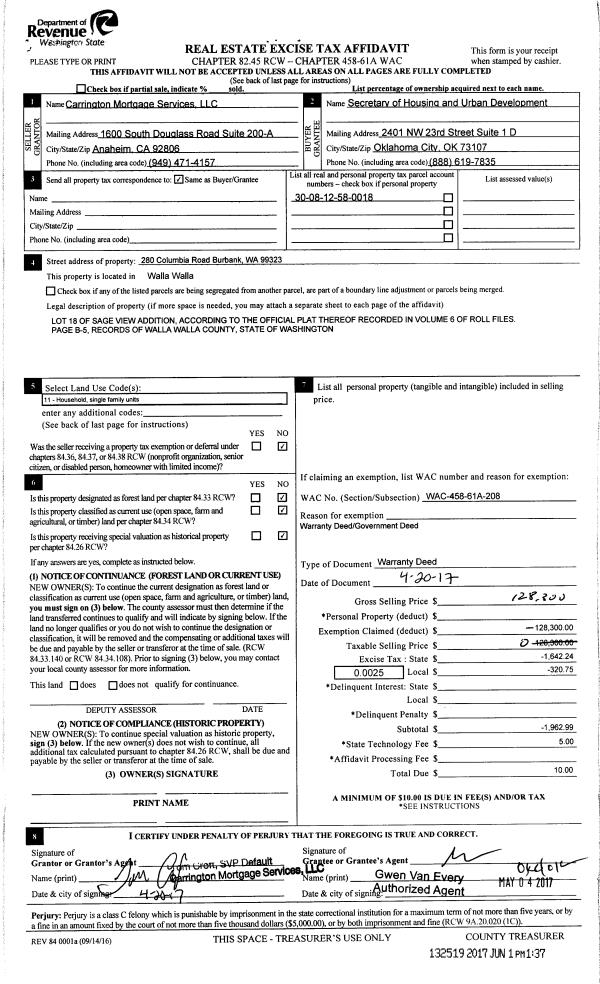 | 2 | 06/01/2017 | WARRANTY D | WARRANTY DEED | CARRINGTON MORTGAGE SERVICES LLC | SECRETARY OF HOUSING & URBAN DEVELOPMENT | | | $128,300.00 | 132519 | 2017-04189 |