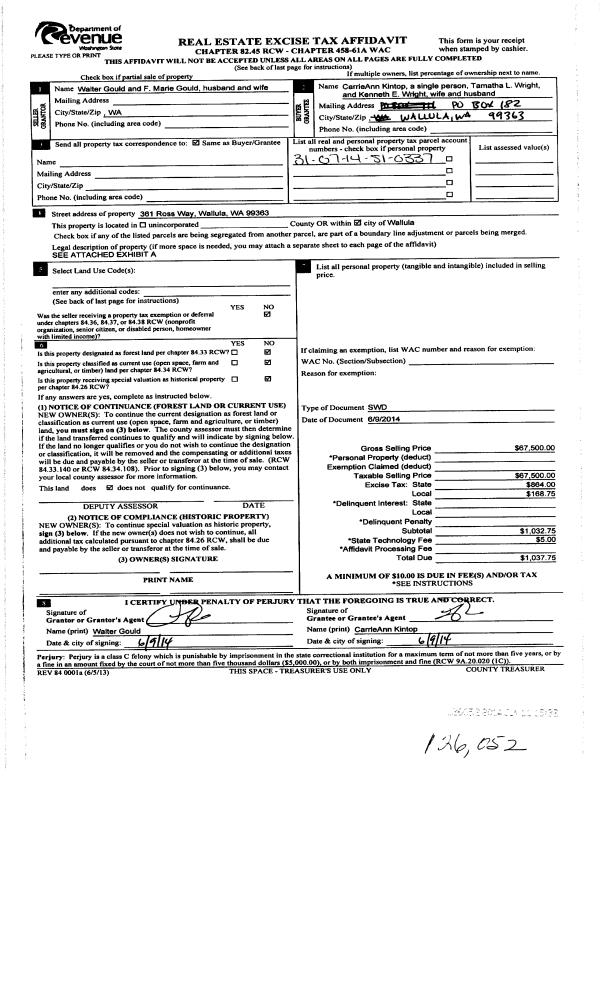 | Mailing Address: | KENNETH E & TAMATHA L WRIGHT PO BOX 182 WALLULA, WA 99363 | % Ownership: | 100.0000000000% |