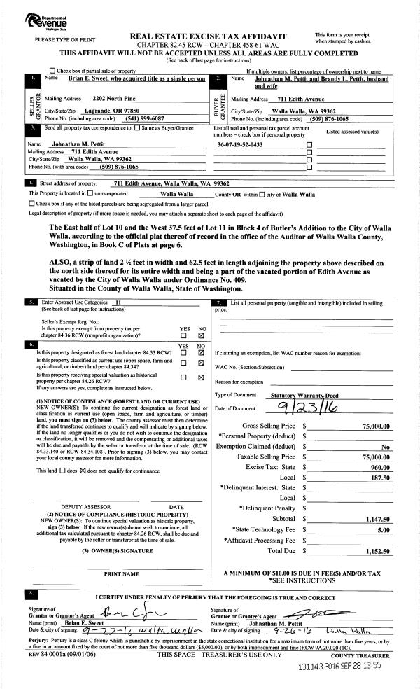 | 3 | 09/28/2016 | SWD | STATUTORY WARRANTY DEED | SWEET BRIAN E | PETTIT JOHNATHAN M & BRANDY L | | | $75,000.00 | 131143 | 2016-07972 |