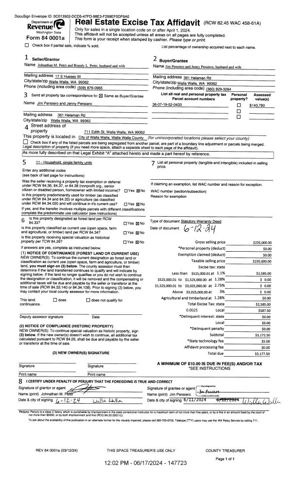 | Mailing Address: | 711 EDITH AVE WALLA WALLA, WA 99362 | % Ownership: | 100.0000000000% |