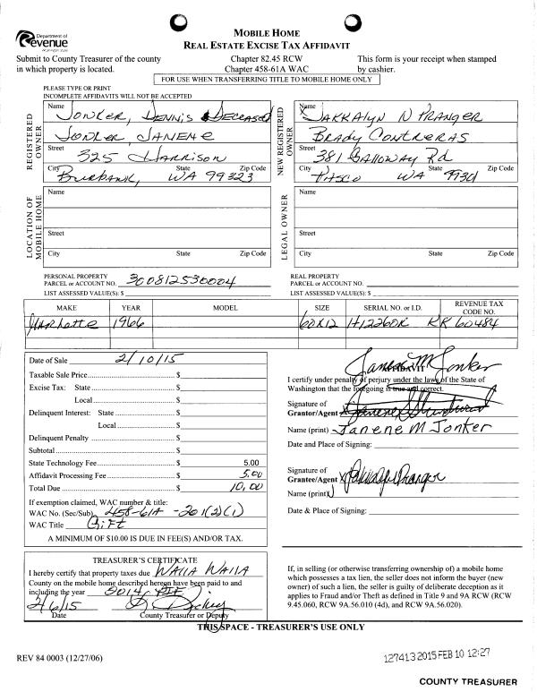 | 1 | 02/10/2015 | MH AFFIDAV | MOBILE HOME AFFIDAVIT | JONKER DENNIS | PRANGER JAKKALYN N | | | | 127413 | MHAFF-127413 |