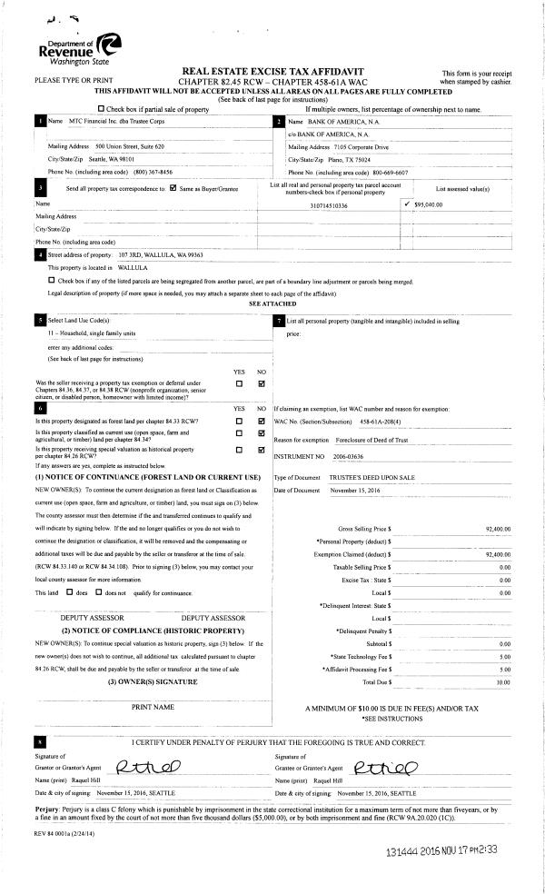 | 4 | 12/26/2017 | SURVEY | SURVEY | MTC FINANCIAL INC | BANK OF AMERICA | | | | 0 | 2017-10416 |