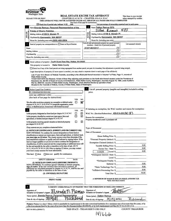| Mailing Address: | DALTON REMUS 4109 S MORAIN PL KENNEWICK, WA 99337 | % Ownership: | 100.0000000000% |