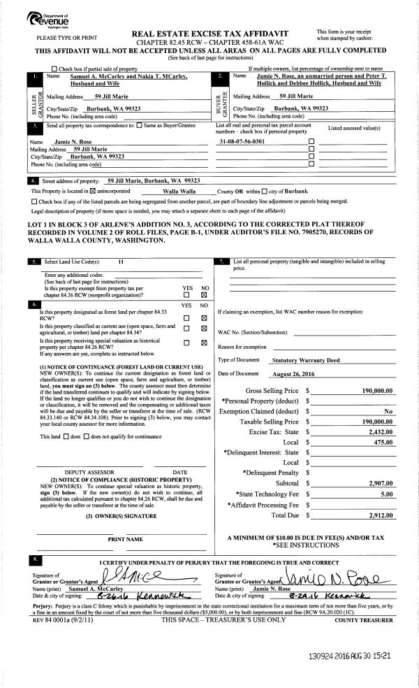 | 1 | 08/30/2016 | SWD | STATUTORY WARRANTY DEED | MC CARLEY SAMUEL A | ROSE JAMIE N & | | | $190,000.00 | 130924 | 2016-06993 |