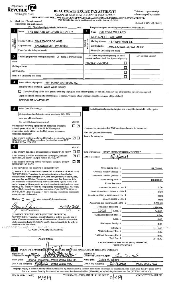 | 3 | 02/28/2024 | EASE | EASEMENT | WILLARD CALEB M & MCKINZEE L | WALLA WALLA COUNTY OF | | | | 147195 | 2024-01001 |