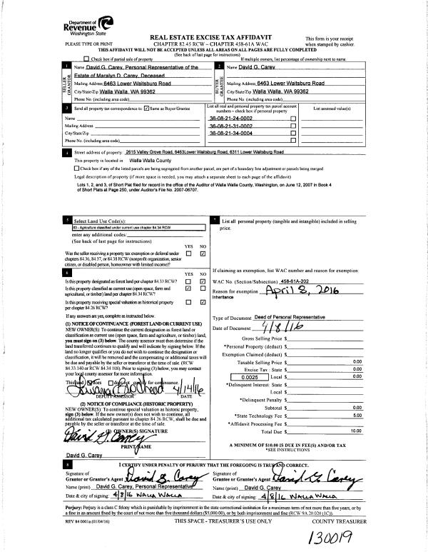 | 3 | 04/08/2016 | DPR | DEED OF PERSONAL REPRESENTATIVE | CAREY DAVID G & MARALYN D | CAREY DAVID ESTATE OF | | | | 130019 | 2016-02713 |