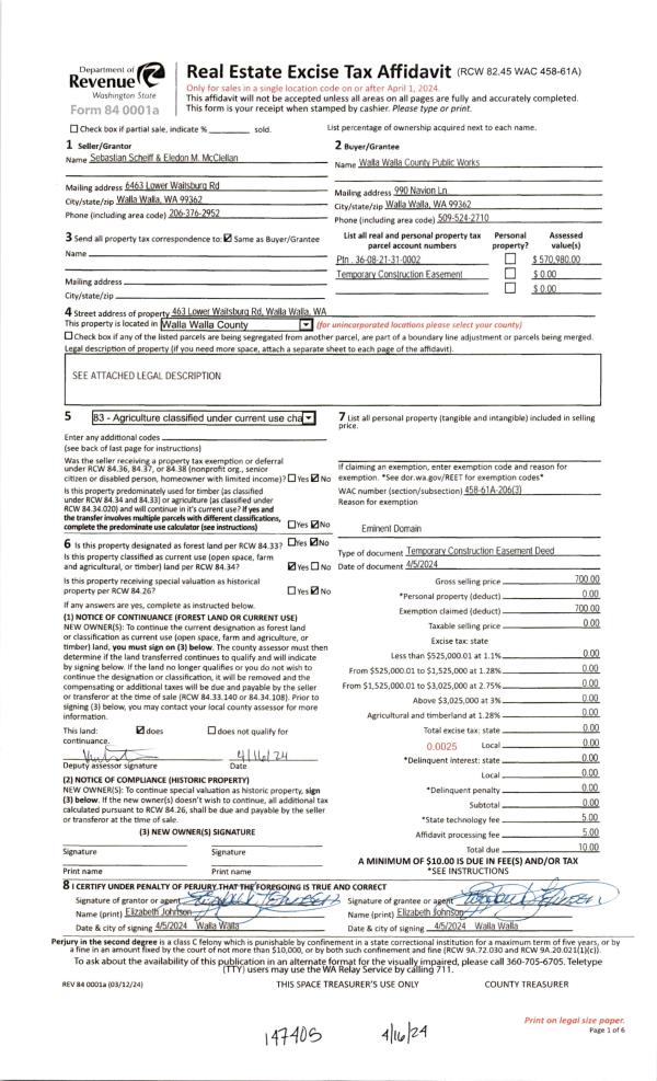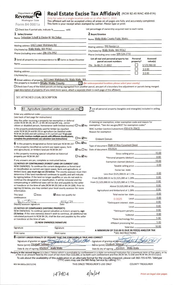 | 1 | 04/16/2024 | EASE | EASEMENT | SCHEIFF SEBASTIAN & EILEDON M MCCLELLAN | WALLA WALLA COUNTY OF | | | | 147404 | 2024-01895 |