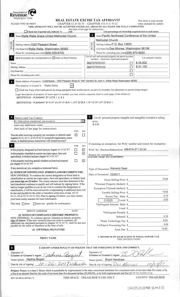 | 1 | 10/24/2017 | WARRANTY D | WARRANTY DEED | UNITED METHODIST CHURCH | PACIFIC NORTHWEST CONFERENCE OF THE | | | $0.00 | 134335 | 2018-02091 |