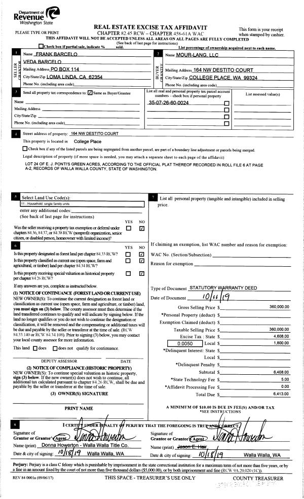 | 2 | 10/18/2019 | SWD | STATUTORY WARRANTY DEED | BARCELO FRANK & VEDA L | LANG-MOUR LLC | | | $360,000.00 | 137902 | 2019-08393 |